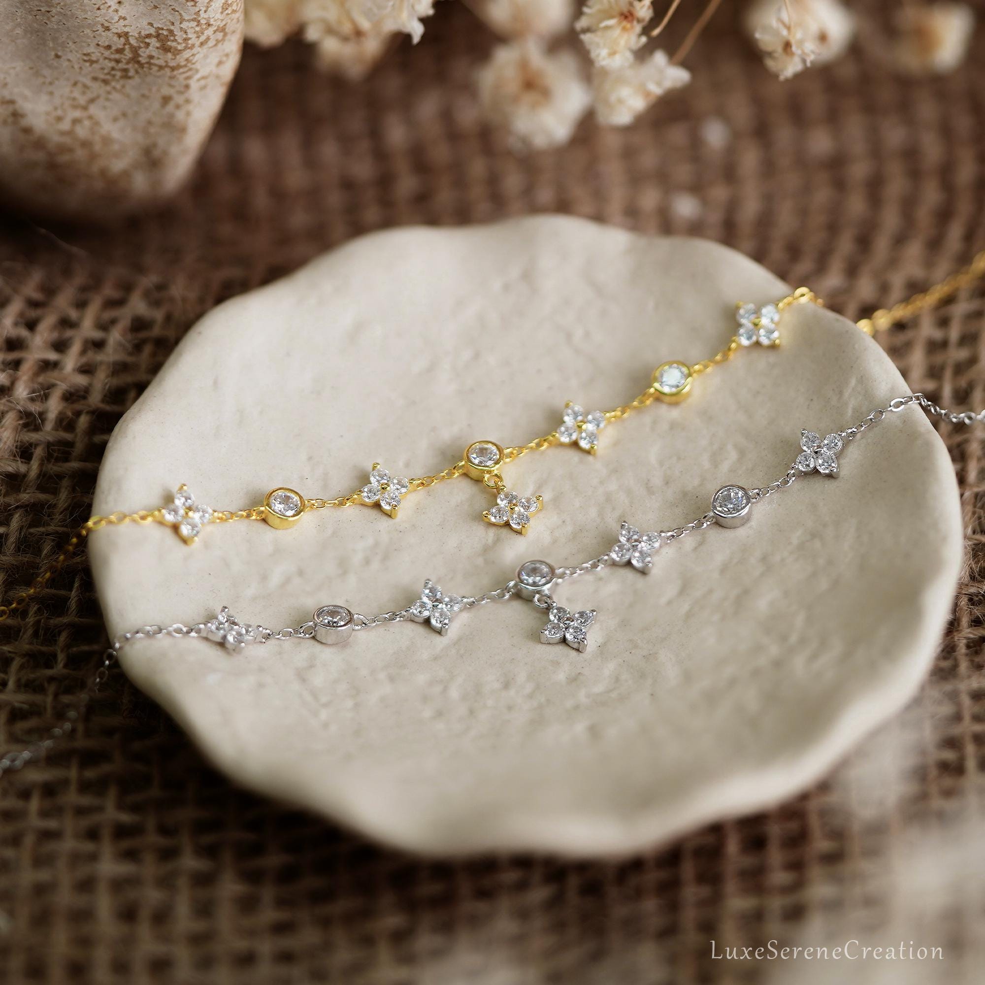 925 Sterling Silver Flowers Diamonds Bracelet, Minimalist Diamond Dangle Bracelet, Gold Bracelet for Women, Bridesmaid Gift, Christmas Gift